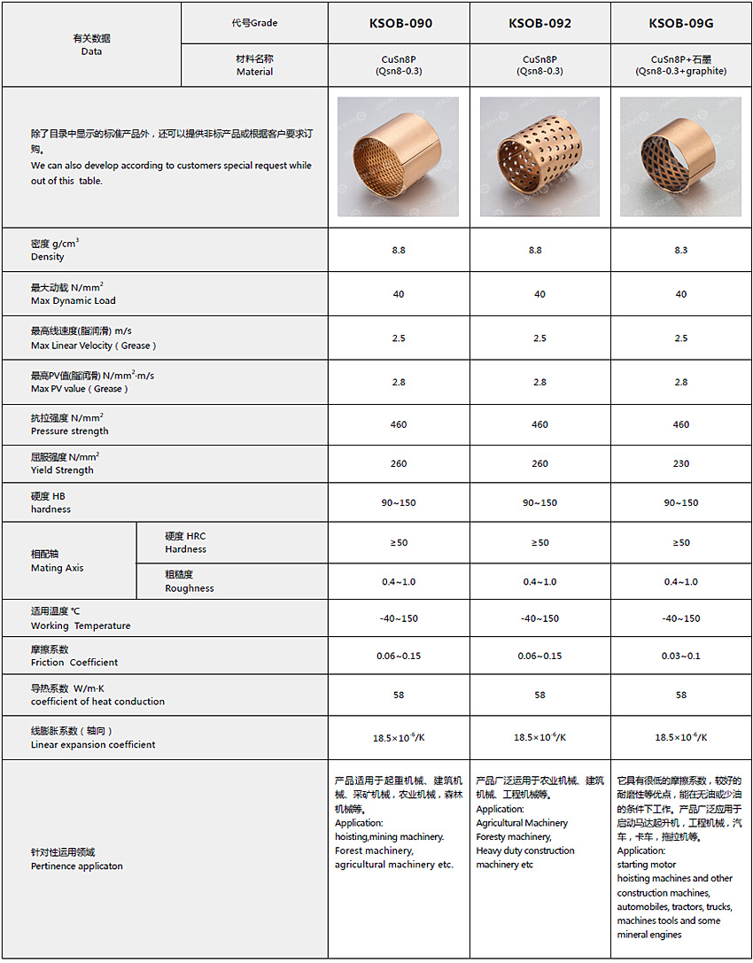 實際運用中根據(jù)使用工況的不同,基體可以采用不同牌號的合金,表面可以加工成其他形式的油孔和油槽。產(chǎn)品范圍包括:KSOB-090、KSOB-092、KSOB-09G。