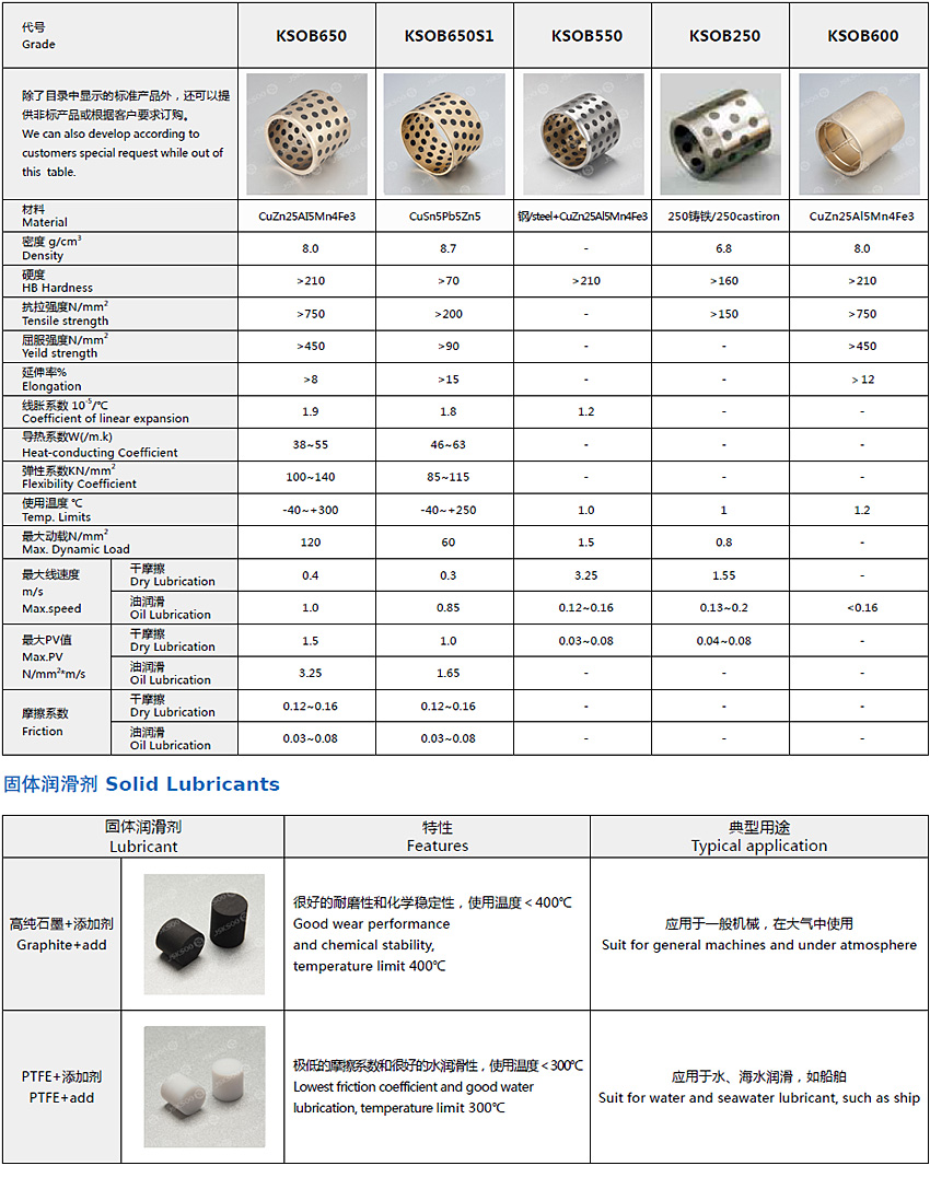 結(jié)構(gòu)特性 KSOB650 系列固體自潤滑軸承以高強(qiáng)度銅合金為基體并按工況需要有規(guī)律的排布一定比列的固體潤滑劑,這種銅基鑲嵌式固體潤滑軸承結(jié)合了銅合金的高承載高耐磨及固體潤滑劑的自潤滑性能,使其在使用過程中大大降低了軸承和設(shè)備的維護(hù)成本。在此基礎(chǔ)上開發(fā)了適合于經(jīng)濟(jì)型和耐沖擊型運(yùn)用的KSOB550 鋼基銅合金鑲嵌型固體潤滑軸承、KSOB250 鑄鐵鑲嵌型固體潤滑軸承和KSOB850 彌散型固體潤滑軸承。